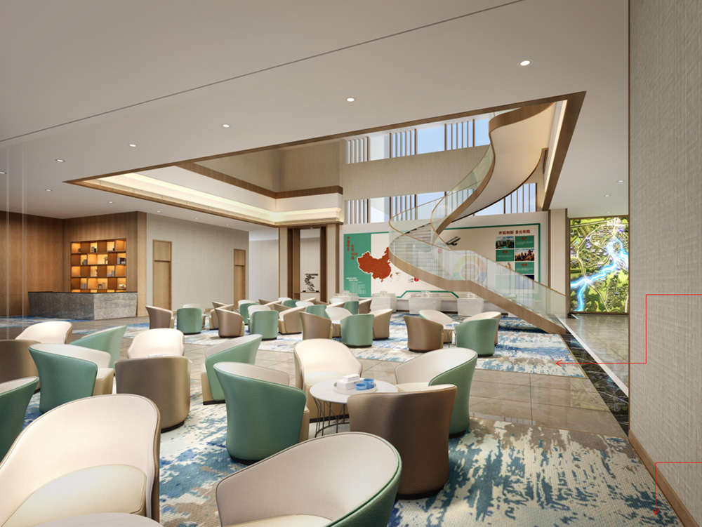 設(shè)計說明:銷售中心分為營銷大廳、接待區(qū)、3D影音室、9A工法展示區(qū)、兒童游樂區(qū)、簽約區(qū)、會議室七大功能分區(qū);天花與地面形大理石材質(zhì)互相呼應(yīng),讓人感受營銷大廳空間的高貴與大氣;雙旋轉(zhuǎn)樓梯圍繞著沙盤,彰顯了銷售中心霸氣的設(shè)計;就像9A工法展示區(qū)的蒂芙尼藍(lán)的與眾不同,秉承始終如一和精準(zhǔn)悉心打造,從設(shè)計到施工到入住打造一個環(huán)境優(yōu)美并安全的入住空間;兒童游樂區(qū)的貼心設(shè)計,讓用戶在購房的過程中能安心無憂的接收樓盤信息,對于兒童來說是一個新的游樂環(huán)境。